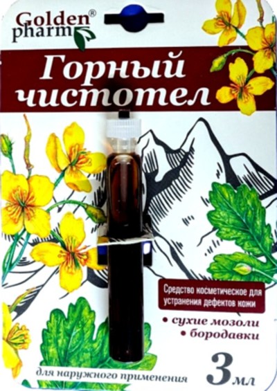 Косметическое средство Горный чистотел применяется для удаления ороговевших частей кожи, сухих мозолей, бородавок. Специально разработанная формула помогает эффективно размягчить и удалить ороговевшие участки, помогает решить проблемы сухих мозолей и бородавок, придавая коже здоровый вид. Формула содержит натуральные ингредиенты, обеспечивающие безопасный и эффективный уход за кожей.Способ применения: Перед применением следует убедиться, что дефект является косметическим. Смазать кожу вокруг косметического дефекта жирным кремом; с помощью специального колпачка-капельницы, закрывающего флакон, нанести средство на зону косметического дефекта. Средство не втирать! После нанесения ощущается легкое жжение в зоне применения! Подождите полного впитывания средства.Igredients: Chelidonium Majus, Urtica dioica, Plantago major, Inonotus obliguus, Thymus serpyllum, Caragana jubata, Arctium lappa, Calendula Officinalis, Tussilago farfara, Artemisia vulgaris, Rhadiola rosea, Distilled water, Ment, Taraxacum officinale (Root), Vaccinium myrtillus, Achillea millefolium.Индивидуальная чувствительность к компонентам продукта. Только для наружного применения. Не использовать на лице! Только для тела. Не допускать попадания косметического средства на соседние участки кожи вблизи дефекта. При попадании на смежные участки кожи промыть участок кожи под проточной водой в течение 5-10 минут. Избегать попадания в глаза и слизистые!