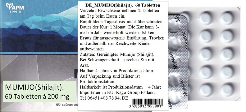Хотя в большинстве стран СНГ это лекарство известно как мумиё, в Индии его используют в качестве шиладжита в аюрведической медицине. Другие имена включают Brogschaun (Тибет и Монголия), Barachschin (Алтайские горы) и Arakul dshibal (Ирак, Иран). На всех языках это означает столько же, сколько горный сок или горный пот. Взрослым принимать по 1 таблетке 1-2 раза в день во время еды. Не превышать рекомендуемую суточную дозу. Продолжительность лечения: 1 месяц. Лечение можно повторять 2- 3 раза в год. Не рекомендуется во время беременности и кормления грудью. Не является заменой сбалансированной и разнообразной диеты. Хранить в прохладном, сухом и недоступном для детей месте. Внимание! Стандарт России, на упаковке и блистере дата изготовления, а в описании Срок годности от даты изготовления. Согласно немецким правилам мы указываем срок годности до. Взрослым принимать по 1 таблетке 1-2 раза в день во время еды. Не превышать рекомендуемую суточную дозу. Продолжительность лечения: 1 месяц. Лечение можно повторять 2- 3 раза в год. Не рекомендуется во время беременности и кормления грудью.Не является заменой сбалансированной и разнообразной диеты.Хранить в прохладном, сухом и недоступном для детей месте.