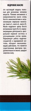 Внимание! Содержание живицы для приема во внутрь – до 10%Содержание живицы более 10% только для наружного применения.Холодного отжима, без добавок (ГМО или консервантов), в защищенном от светаКомплекс из 100% натуральных ингредиентов, Вегатирианский, без глютена и лактозыНатуральность и чистота - основа здоровья, красоты и долголетия.Кедры растут в красивом районе Алтая в России, где природа все еще в порядке.Комплекс из кедровой смолы, масла кедрового ореха уникален и состоит из витаминов, минералов, жиров и полиненасыщенных жирных кислот. Смесь кедровой смолы и масла кедрового ореха, известная как терпентиновая бальзам, в различных концентрациях оказывает более сильное действие, чем любой отдельный ингредиент.Масло кедрового ореха - символ силы, здоровья, долголетия и стойкости.Состав: жиры: насыщенные 7,8 г, мононенасыщенные 27,2 г, полиненасыщенные: 64,1 г, витамин E 30,6 мгКедровая смола (скипидар) содержит янтарную кислоту, соединения кислорода, смоляные кислоты, витамины C и D, основные минералы, микро- и макроэлементы. Это натуральный продукт с натуральными свойствами, обладающий сильными антибактериальными, противовоспалительными и противогрибковыми свойствами.Пищевая ценность: жир: (г / 100 г) = 99,8 г; Углеводы: (г / 100 г) = 0 г; Белки: (г / 100 г) = 0 г; Энергетическая ценность: 898 ккал / 100 г.Состав: масло кедровое 90%, Живица (кедровая смола) 10%Применение: по 0,5 чайной ложки 3 раза в день за 20-30 минут до еды (без нарушения работы пищеварительной системы, печени и желчевыводящих путей). При проблемах с язвой желудка, гастритом, энтероколитом, панкреатитом, воспалительными заболеваниями печени, гепатозом или ожирением печени следует принимать через 30 минут после еды. Или проконсультируйтесь со своим врачом.Противопоказание: индивидуальная непереносимость ингредиентов продукта. Пищевые добавки не заменяют сбалансированное и разнообразное питание и здоровый образ жизни. Не превышайте рекомендованное потребление пищевых добавок. Хранить в прохладном, сухом, недоступном для маленьких детей, защищенном от света месте.Importeur in EU: Kag Group OÜ.74114, Maardu linn, Tel: 372 5551 7787Vertrieb: Lobyrin, Rotlehm 29, 35099 Bottendorf, Tel: 064514087894