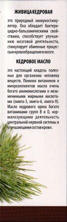 Внимание! Содержание живицы для приема во внутрь – до 10%Содержание живицы более 10% только для наружного применения.Холодного отжима, без добавок (ГМО или консервантов), в защищенном от светаКомплекс из 100% натуральных ингредиентов, Вегатирианский, без глютена и лактозыНатуральность и чистота - основа здоровья, красоты и долголетия.Кедры растут в красивом районе Алтая в России, где природа все еще в порядке.Комплекс из кедровой смолы, масла кедрового ореха уникален и состоит из витаминов, минералов, жиров и полиненасыщенных жирных кислот. Смесь кедровой смолы и масла кедрового ореха, известная как терпентиновая бальзам, в различных концентрациях оказывает более сильное действие, чем любой отдельный ингредиент.Масло кедрового ореха - символ силы, здоровья, долголетия и стойкости.Состав: жиры: насыщенные 7,8 г, мононенасыщенные 27,2 г, полиненасыщенные: 64,1 г, витамин E 30,6 мгКедровая смола (скипидар) содержит янтарную кислоту, соединения кислорода, смоляные кислоты, витамины C и D, основные минералы, микро- и макроэлементы. Это натуральный продукт с натуральными свойствами, обладающий сильными антибактериальными, противовоспалительными и противогрибковыми свойствами.Пищевая ценность: жир: (г / 100 г) = 99,8 г; Углеводы: (г / 100 г) = 0 г; Белки: (г / 100 г) = 0 г; Энергетическая ценность: 898 ккал / 100 г.Состав: масло кедровое 90%, Живица (кедровая смола) 10%Мумиё: Действие этого природного комплекса (кедровое масло и кедровая смола) дополняется положительными эффектами мумие. Мумие оказывает профилактическое действие при вирусных и других воспалительных процессах и простудных заболеваниях. Именно по этой причине продукт, полученный из кедровой смолы, обладает антибактериальными, противоинфекционными, антисептическими и регенерирующими свойствами.Применение: по 0,5 чайной ложки 3 раза в день за 20-30 минут до еды (без нарушения работы пищеварительной системы, печени и желчевыводящих путей).При проблемах с язвой желудка, гастритом, энтероколитом, панкреатитом, воспалительными заболеваниями печени, гепатозом или ожирением печени следует принимать через 30 минут после еды. Или проконсультируйтесь со своим врачом.Противопоказание: индивидуальная непереносимость ингредиентов продукта. Пищевые добавки не заменяют сбалансированное и разнообразное питание и здоровый образ жизни. Не превышайте рекомендованное потребление пищевых добавок. Хранить в прохладном, сухом, недоступном для маленьких детей, защищенном от света месте.Importeur in EU: Kag Group OÜ.74114, Maardu linn, Tel: 372 5551 7787Vertrieb: Lobyrin, Rotlehm 29, 35099 Bottendorf, Tel: 064514087894
